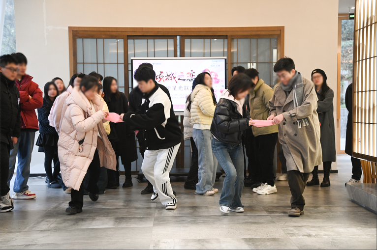 破冰环节成为拉近彼此距离的关键一步,青年们根据手中的号码牌,寻找对应的另一半,两两相对而坐,开启了真诚的自我介绍。简单的问候、真挚的分享,让原本陌生的氛围逐渐升温,默契在不经意间悄然滋生,为后续的互动奠定了良好基础。趣味十足的游戏环节更是将活动氛围推向高潮。“幸福接力” 游戏中,男女嘉宾协作配合,用 A4 纸小心翼翼地传递乒乓球,过程中既有紧张刺激的比拼,又有欢声笑语的互动,大家在协作中增进了解、加深信任;“听曲识歌” 环节,经典旋律响起,青年们踊跃抢答,展现出丰富的音乐储备,台下掌声与喝彩声不断;“你比我猜” 游戏则考验着搭档间的默契,夸张的肢体动作与巧妙的语言提示相映成趣,现场充满了欢乐的气息。一系列精心设计的游戏,让青年们在轻松愉悦的氛围中彻底放下拘谨,尽情释放活力,陌生感逐渐消散,情谊在互动中悄然升温。
